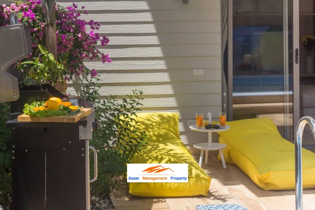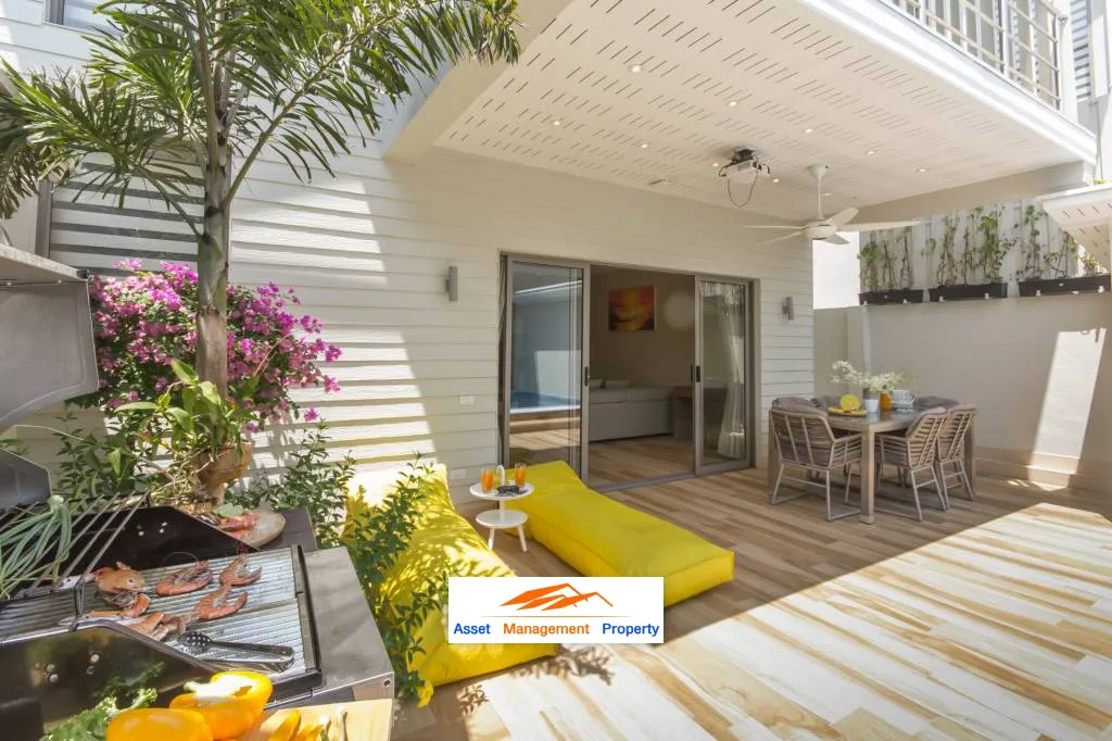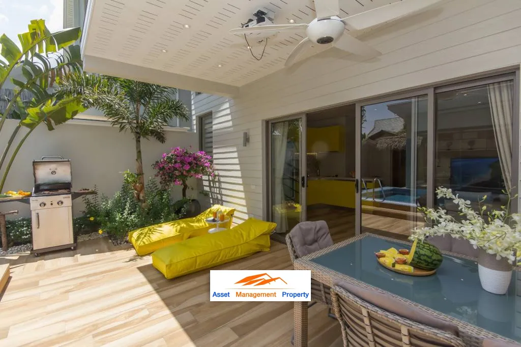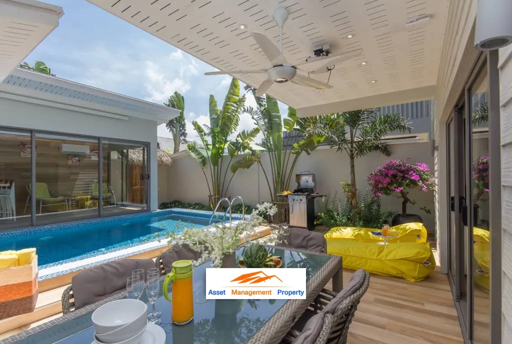 Poolside area which is also a lounge area has-first and foremost-the pool itself with non-chlorine filteredwater.Everything you need to spend your leisure time is there: big sunbeds,a small green garden, cozy party cushions, a big table and a barbeque grill for those whoenjoy their meals under the sky. It’s a Ban Tai Estate villa and of course there is an open-aircinema with projector screen installed outdoors where you can watch movies from the dining room.