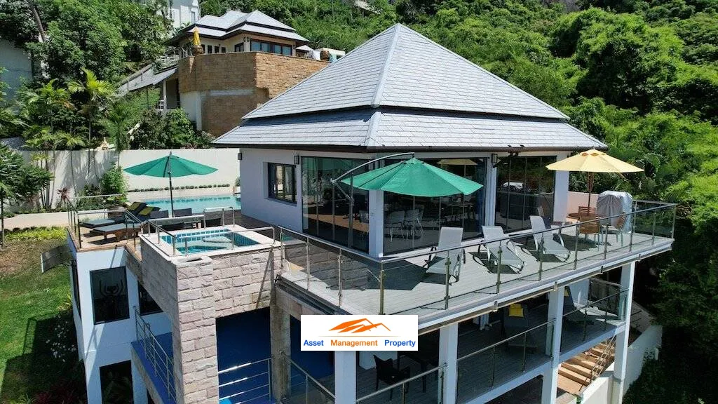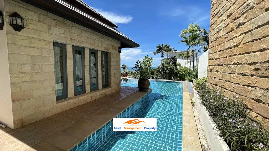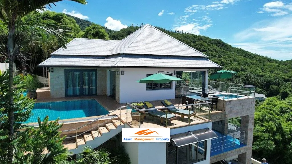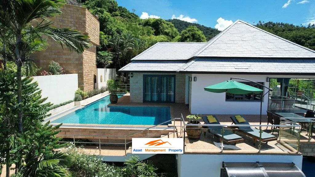 a fully furnished and move-in ready 4 Bed, 4 Bath Sea View Villa perched on a tranquil hillside position between Lamai and Hua Thanon with an expressive southern exposure over the Gulf of Thailand. With a harmonious balance of aesthetics, creativity and functionality perfect for island living, this 3-storey villa is a masterpiece of solitude including a self-contained apartment featured on the middle floor. From the very entrance, a magical oasis unfolds, filled with lush lawns and tropical landscaped with south-east expanses to the distant horizon.