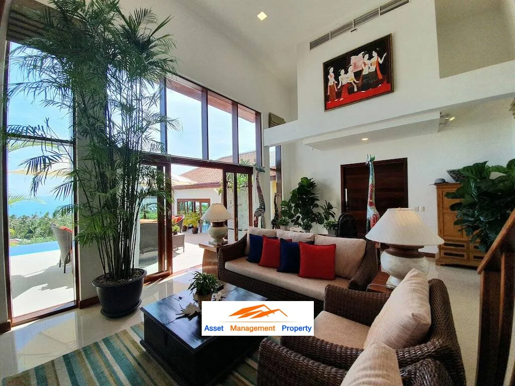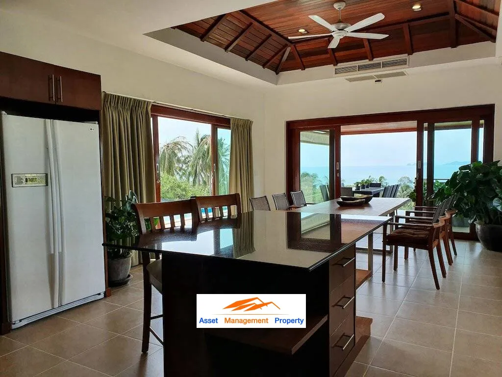 This Ko Samui villa for sale is the crowning glory of this estate, comprised of four bedrooms and glorious sea views! Indeed, views take center stage in this residence that stuns with coastal charm, breathtaking vistas, and top of the line finishes. Commanding a built-in space of 700 square meters this villa boasts a spectacular floor plan with teak doors throughout, air-conditioning and endless glass. The ground floor living room greets guests with double-wide entrance doors into a palatial room with 15 feet high ceilings and extra-large scenic windows ensuring there is no shortage of daylight, plus access to the rear garden terrace. An air-conditioned upper-level family room opens out to a balcony to provide additional recreational space, along with a hobbies room or maid’s room with its own ensuite bathroom. The well equipped, modern style kitchen is impressive, complete with fitted cabinets and a large center island with top-grade gold speckled black granite countertops. This space adjoins to the spacious air-conditioned dining room with timber feature ceiling.